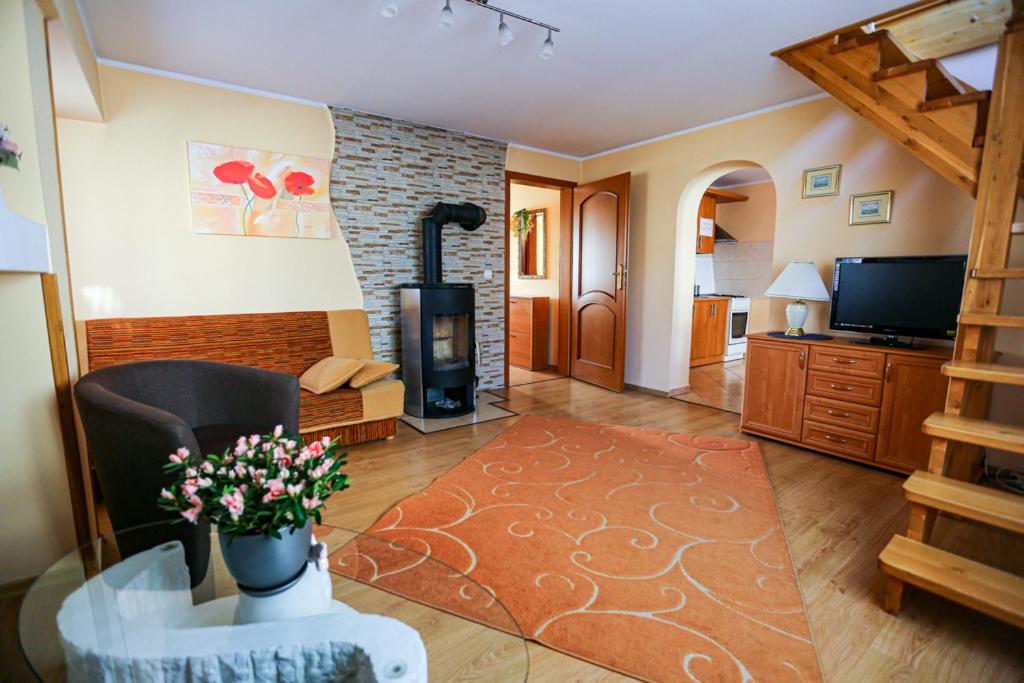 Apartament dwupoziomowy. This apartment features a fireplace. This spacious apartment features 1 living room, 2 separate bedrooms and 1 bathroom with a shower. The apartments kitchenette, which has a refrigerator and kitchenware, is available for cooking and storing food. The apartment features a tea and coffee maker, a seating area, parquet floors, heating and a flat-screen TV with cable channels. The unit has 3 beds. Apartament - 6 osobowy. Powierzchnia pokoju ok.: 70 mkw.
