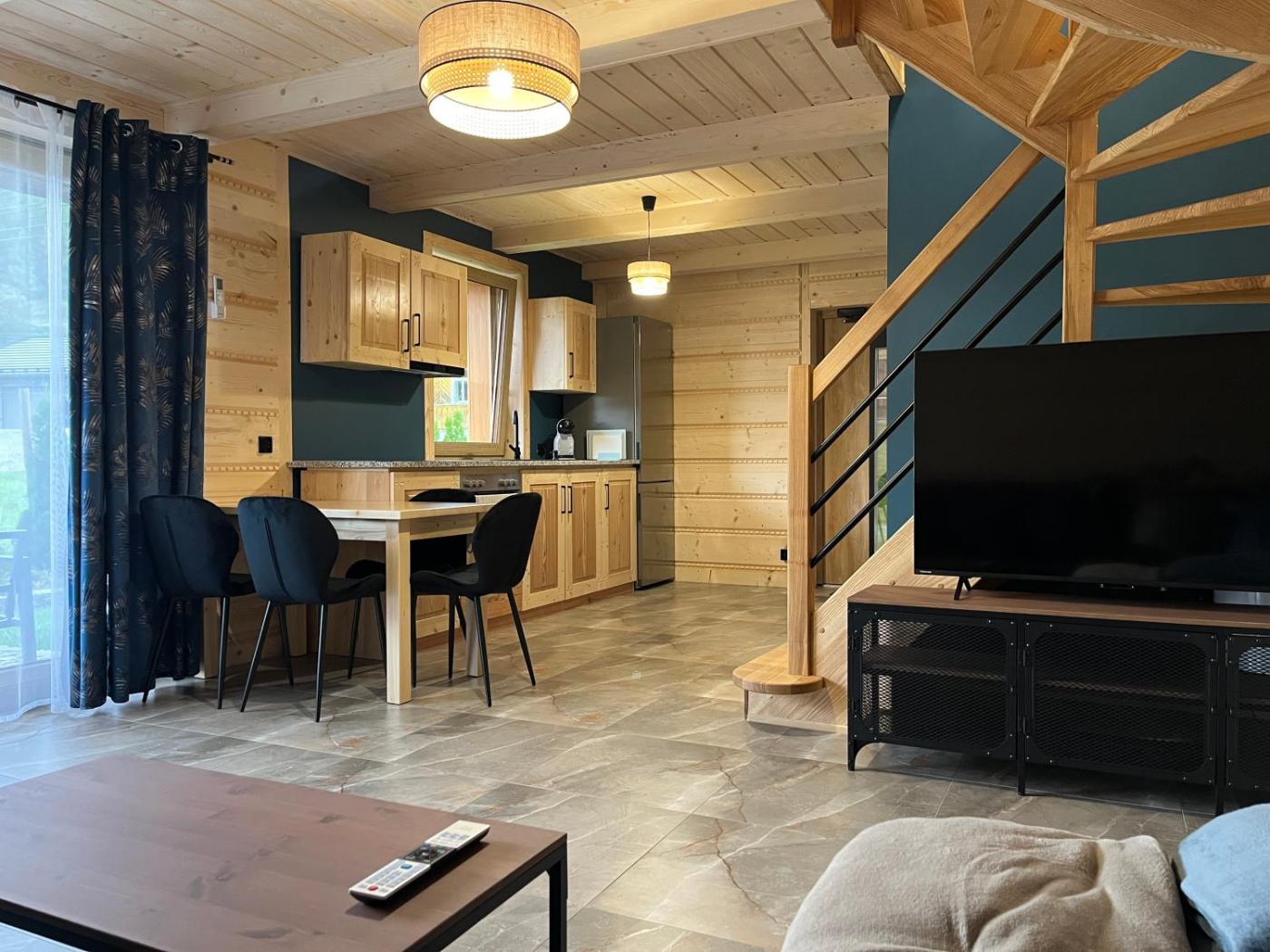 Domek z 2 sypialniami. This air-conditioned chalet comprises 1 living room, 2 separate bedrooms and 2 bathrooms with a bath or a shower. Meals can be prepared in the well-fitted kitchen, which is equipped with a stovetop, a refrigerator, a dishwasher and kitchenware. Featuring a terrace with garden views, this chalet also provides a washing machine and a flat-screen TV with streaming services. The unit offers 5 beds. Domek - 6 osobowy. Powierzchnia pokoju ok.: 10 mkw. ;