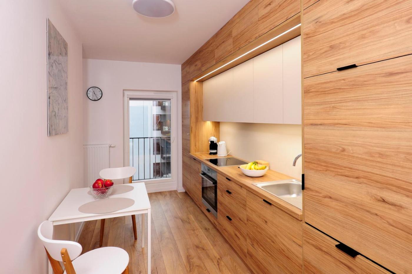 Apartament typu Deluxe. Boasting a private entrance, this apartment features a kitchen, 1 bedroom and 1 bathroom with a bath or a shower and a hairdryer. Meals can be prepared in the well-fitted kitchen, which features a stovetop, a refrigerator, a dishwasher and kitchenware. The apartment features a flat-screen TV, a washing machine, soundproof walls, a tea and coffee maker as well as city views. The unit has 1 bed. Apartament - 2 osobowy. Powierzchnia pokoju ok.: 34 mkw. ;